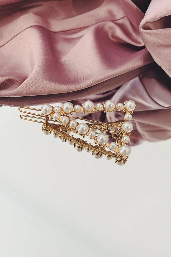 The Gold Triangle Clip with Pearl Detailing adds a touch to class and elegance to any look. Featuring a delicate gold frame and multi-size Pearl detailing, this style pairs perfectly with our simple gowns.Â