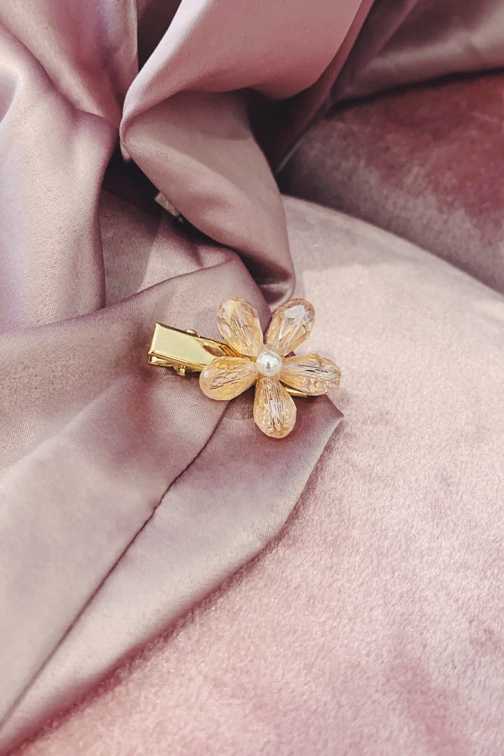 The Mini Flower Hair Clip is perfect. It features a unique flower design with beaded detailing and is available in three different colours.