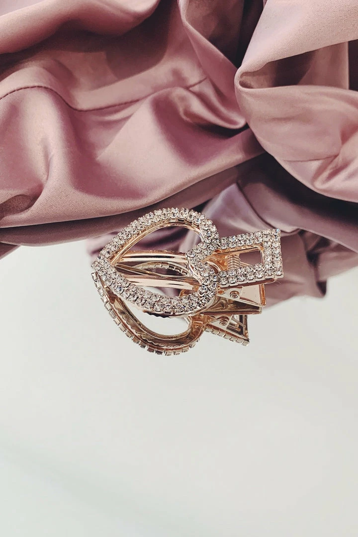 Glam up your next formal look with the Rose Gold Crystal Heart Clip. Encrusted with rose gold, crystal details, this style pairs perfectly with our simple gowns.Â